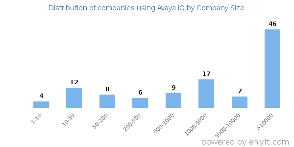We have data on 111 companies that use Avaya IQ. The companies using Avaya IQ are most often found in United States and in the Information Technology and Services industry. Avaya IQ is most often used by companies with >10000 employees and >1000M dollars in revenue. Our data for Avaya IQ usage goes back as far as 10 years and 1 months.