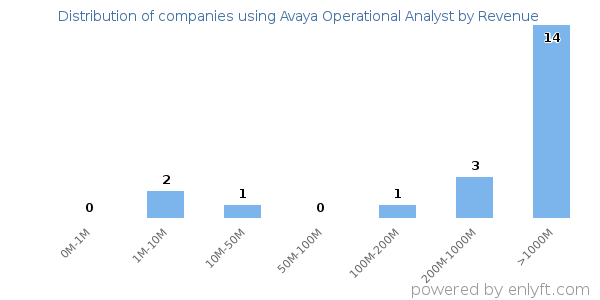 Of all the customers that are using Avaya Operational Analyst, a majority (73%) are large (>$1000M), 6% are small (<$50M) and 0% are medium-sized.