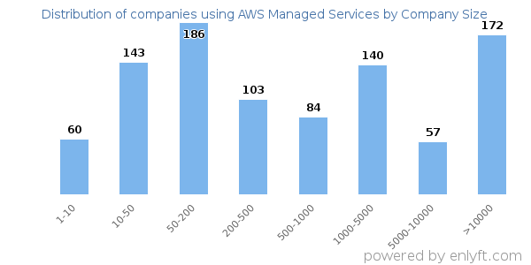 Of all the customers that are using AWS Managed Services, 21% are small (<50 employees), 39% are medium-sized and 39% are large (>1000 employees).