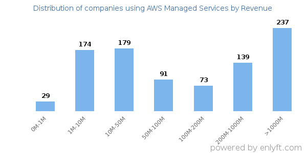 We have data on 969 companies that use AWS Managed Services. The companies using AWS Managed Services are most often found in United States and in the Information Technology and Services industry. AWS Managed Services is most often used by companies with 50-200 employees and >1000M dollars in revenue. Our data for AWS Managed Services usage goes back as far as 6 years and 1 months.