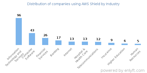 We have data on 349 companies that use AWS Shield. The companies using AWS Shield are most often found in United States and in the Information Technology and Services industry. AWS Shield is most often used by companies with >10000 employees and >1000M dollars in revenue. Our data for AWS Shield usage goes back as far as 4 years.