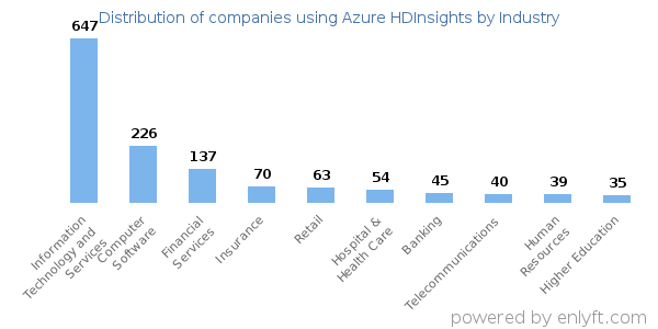 We have data on 2,114 companies that use Azure HDInsights. The companies using Azure HDInsights are most often found in United States and in the Information Technology and Services industry. Azure HDInsights is most often used by companies with >10000 employees and >1000M dollars in revenue. Our data for Azure HDInsights usage goes back as far as 8 years and 1 months.