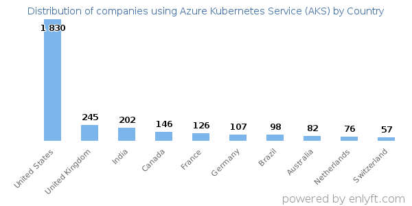 We have data on 3,774 companies that use Azure Kubernetes Service (AKS). The companies using Azure Kubernetes Service (AKS) are most often found in United States and in the Information Technology and Services industry. Azure Kubernetes Service (AKS) is most often used by companies with 50-200 employees and >1000M dollars in revenue. Our data for Azure Kubernetes Service (AKS) usage goes back as far as 4 years and 8 months.