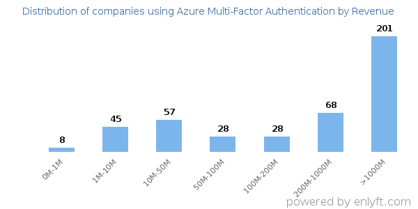 We have data on 447 companies that use Azure Multi-Factor Authentication. The companies using Azure Multi-Factor Authentication are most often found in United States and in the Information Technology and Services industry. Azure Multi-Factor Authentication is most often used by companies with >10000 employees and >1000M dollars in revenue. Our data for Azure Multi-Factor Authentication usage goes back as far as 7 years and 5 months.