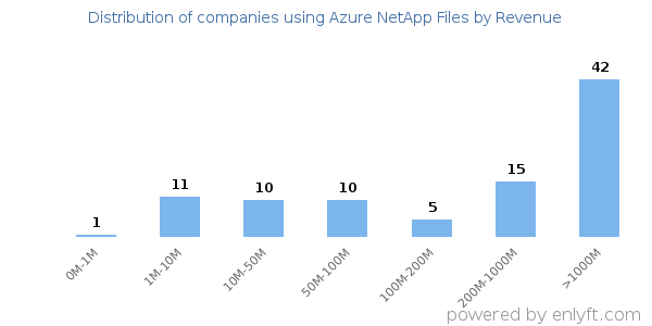 We have data on 97 companies that use Azure NetApp Files. The companies using Azure NetApp Files are most often found in United States and in the Information Technology and Services industry. Azure NetApp Files is most often used by companies with >10000 employees and >1000M dollars in revenue. Our data for Azure NetApp Files usage goes back as far as 3 years and 6 months.