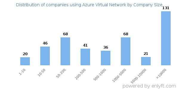 We have data on 441 companies that use Azure Virtual Network. The companies using Azure Virtual Network are most often found in United States and in the Information Technology and Services industry. Azure Virtual Network is most often used by companies with >10000 employees and >1000M dollars in revenue. Our data for Azure Virtual Network usage goes back as far as 7 years and 5 months.