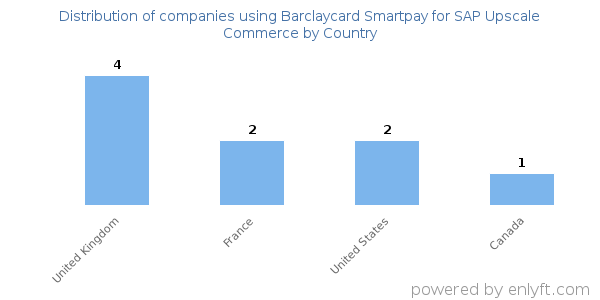 We have data on 10 companies that use Barclaycard Smartpay for SAP Upscale Commerce. The companies using Barclaycard Smartpay for SAP Upscale Commerce are most often found in United Kingdom and in the Information Technology and Services industry. Barclaycard Smartpay for SAP Upscale Commerce is most often used by companies with 50-200 employees and 1M-10M dollars in revenue. Our data for Barclaycard Smartpay for SAP Upscale Commerce usage goes back as far as 3 years and 5 months.