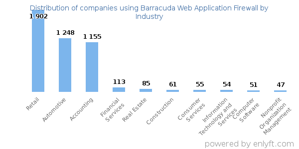 Looking at Barracuda Web Application Firewall customers by industry, we find that Retail (28%), Automotive (18%) and Accounting (17%) are the largest segments.