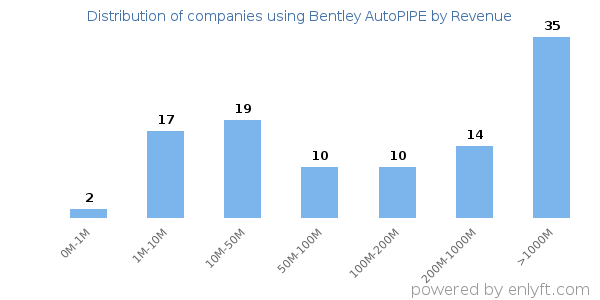 We have data on 114 companies that use Bentley AutoPIPE. The companies using Bentley AutoPIPE are most often found in United States and in the Machinery industry. Bentley AutoPIPE is most often used by companies with >10000 employees and >1000M dollars in revenue. Our data for Bentley AutoPIPE usage goes back as far as 2 years and 11 months.