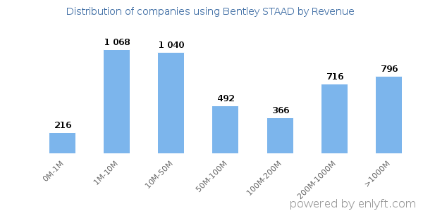 We have data on 5,027 companies that use Bentley STAAD. The companies using Bentley STAAD are most often found in United States and in the Construction industry. Bentley STAAD is most often used by companies with 50-200 employees and 1M-10M dollars in revenue. Our data for Bentley STAAD usage goes back as far as 10 years and 6 months.