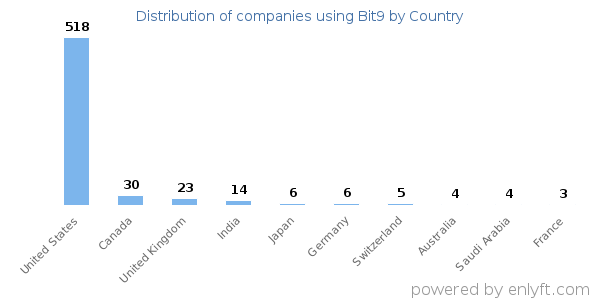 We have data on 640 companies that use Bit9. The companies using Bit9 are most often found in United States and in the Information Technology and Services industry. Bit9 is most often used by companies with >10000 employees and >1000M dollars in revenue. Our data for Bit9 usage goes back as far as 10 years and 2 months.