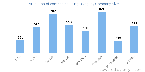 We have data on 4,251 companies that use Bizagi. The companies using Bizagi are most often found in Brazil and in the Information Technology and Services industry. Bizagi is most often used by companies with 1000-5000 employees and >1000M dollars in revenue. Our data for Bizagi usage goes back as far as 3 years and 6 months.
