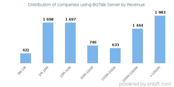 We have data on 9,135 companies that use BizTalk Server. The companies using BizTalk Server are most often found in United States and in the Information Technology and Services industry. BizTalk Server is most often used by companies with 50-200 employees and >1000M dollars in revenue. Our data for BizTalk Server usage goes back as far as 10 years and 2 months.