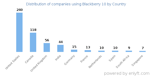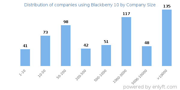 We have data on 616 companies that use Blackberry 10. The companies using Blackberry 10 are most often found in United States and in the Information Technology and Services industry. Blackberry 10 is most often used by companies with >10000 employees and >1000M dollars in revenue. Our data for Blackberry 10 usage goes back as far as 9 years and 10 months.