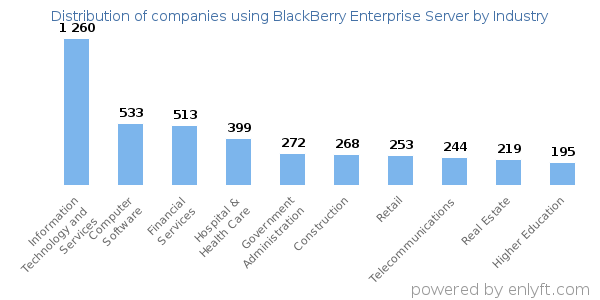 Looking at BlackBerry Enterprise Server customers by industry, we find that Information Technology and Services (13%), Computer Software (6%) and Financial Services (5%) are the largest segments.