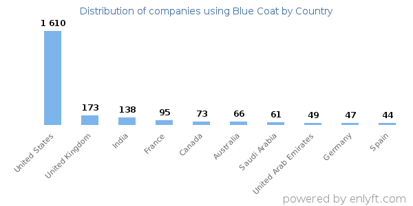 We have data on 2,986 companies that use Blue Coat. The companies using Blue Coat are most often found in United States and in the Information Technology and Services industry. Blue Coat is most often used by companies with >10000 employees and >1000M dollars in revenue. Our data for Blue Coat usage goes back as far as 10 years and 6 months.