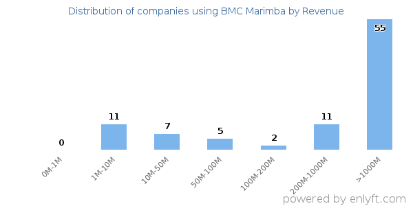 We have data on 94 companies that use BMC Marimba. The companies using BMC Marimba are most often found in United States and in the Information Technology and Services industry. BMC Marimba is most often used by companies with >10000 employees and >1000M dollars in revenue. Our data for BMC Marimba usage goes back as far as 9 years and 4 months.