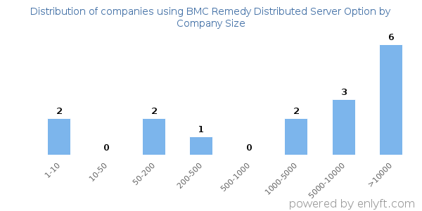 Of all the customers that are using BMC Remedy Distributed Server Option, 7% are small (<$50M), 0% are medium-sized and 45% are large (>$1000M).