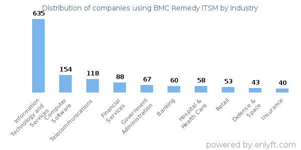 We have data on 2,108 companies that use BMC Remedy ITSM. The companies using BMC Remedy ITSM are most often found in United States and in the Information Technology and Services industry. BMC Remedy ITSM is most often used by companies with >10000 employees and >1000M dollars in revenue. Our data for BMC Remedy ITSM usage goes back as far as 10 years and 2 months.