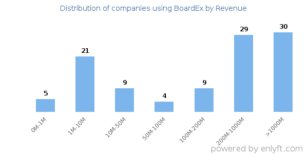 We have data on 114 companies that use BoardEx. The companies using BoardEx are most often found in United States and in the Higher Education industry. BoardEx is most often used by companies with >10000 employees and >1000M dollars in revenue. Our data for BoardEx usage goes back as far as 3 years and 2 months.