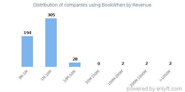 Of all the customers that are using BookWhen, a majority (72%) are small (<$50M), 18% are large (>$1000M) and 9% are medium-sized.