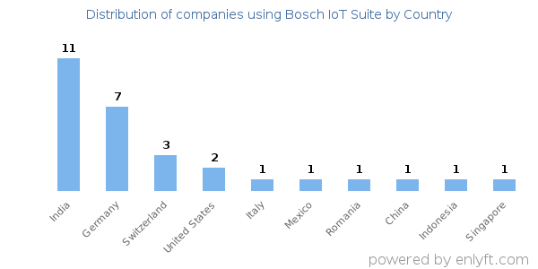 We have data on 34 companies that use Bosch IoT Suite. The companies using Bosch IoT Suite are most often found in India and in the Information Technology and Services industry. Bosch IoT Suite is most often used by companies with >10000 employees and >1000M dollars in revenue. Our data for Bosch IoT Suite usage goes back as far as 8 years and 2 months.
