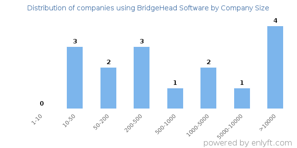 Of all the customers that are using BridgeHead Software, 13% are small (<50 employees), 21% are medium-sized and 26% are large (>1000 employees).