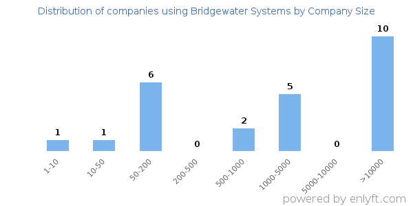 Of all the customers that are using Bridgewater Systems, a majority (50%) are large (>$1000M), 21% are small (<$50M) and 0% are medium-sized.
