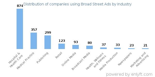 We have data on 2,853 companies that use Broad Street Ads. The companies using Broad Street Ads are most often found in United States and in the Hospital & Health Care industry. Broad Street Ads is most often used by companies with 1-10 employees and 1M-10M dollars in revenue. Our data for Broad Street Ads usage goes back as far as 5 years and 2 months.