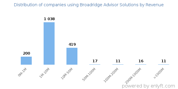 We have data on 1,847 companies that use Broadridge Advisor Solutions. The companies using Broadridge Advisor Solutions are most often found in United States and in the Financial Services industry. Broadridge Advisor Solutions is most often used by companies with 1-10 employees and 1M-10M dollars in revenue. Our data for Broadridge Advisor Solutions usage goes back as far as 8 years and 10 months.