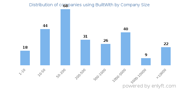 Of all the customers that are using BuiltWith, 45% are small (<$50M), 21% are medium-sized and 27% are large (>$1000M).