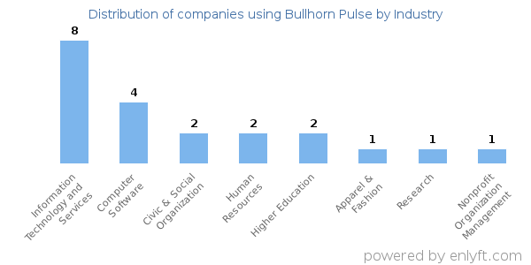 Looking at Bullhorn Pulse customers by industry, we find that Information Technology and Services (32%), Computer Software (14%), Civic & Social Organization (5%), Human Resources (5%) and Higher Education (5%) are the largest segments.