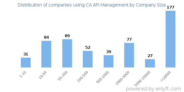 We have data on 591 companies that use CA API Management. The companies using CA API Management are most often found in United States and in the Information Technology and Services industry. CA API Management is most often used by companies with >10000 employees and >1000M dollars in revenue. Our data for CA API Management usage goes back as far as 8 years and 5 months.