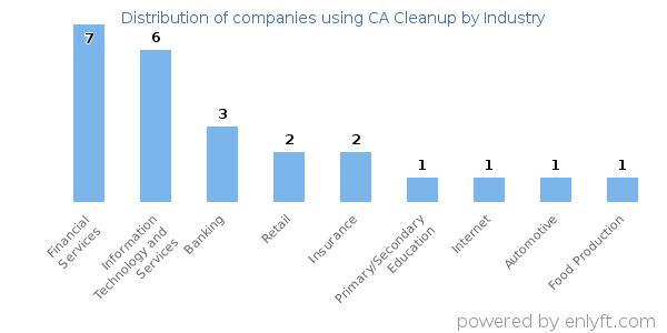 We have data on 26 companies that use CA Cleanup. The companies using CA Cleanup are most often found in United States and in the Financial Services industry. CA Cleanup is most often used by companies with >10000 employees and >1000M dollars in revenue. Our data for CA Cleanup usage goes back as far as 9 years and 7 months.