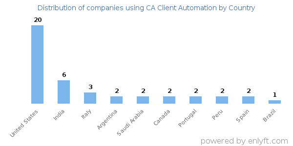 We have data on 49 companies that use CA Client Automation. The companies using CA Client Automation are most often found in United States and in the Information Technology and Services industry. CA Client Automation is most often used by companies with >10000 employees and >1000M dollars in revenue. Our data for CA Client Automation usage goes back as far as 9 years and 7 months.