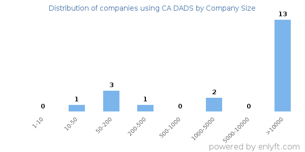 We have data on 20 companies that use CA DADS. The companies using CA DADS are most often found in United States and in the Information Technology and Services industry. CA DADS is most often used by companies with >10000 employees and >1000M dollars in revenue. Our data for CA DADS usage goes back as far as 10 years and 2 months.
