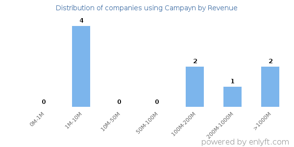 Of all the customers that are using Campayn, 32% are small (<$50M), 12% are medium-sized and 12% are large (>$1000M).