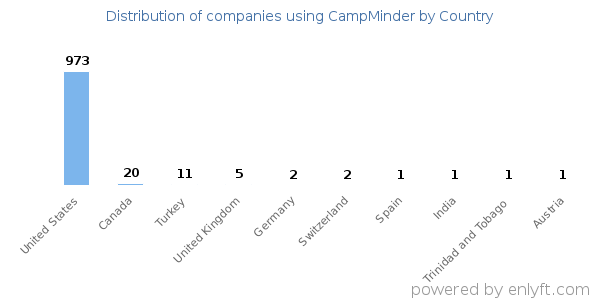 We have data on 1,063 companies that use CampMinder. The companies using CampMinder are most often found in United States and in the Recreational Facilities and Services industry. CampMinder is most often used by companies with 50-200 employees and 1M-10M dollars in revenue. Our data for CampMinder usage goes back as far as 8 years and 7 months.