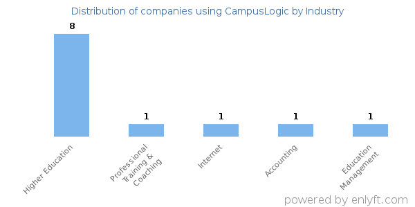 We have data on 12 companies that use CampusLogic. The companies using CampusLogic are most often found in United States and in the Higher Education industry. CampusLogic is most often used by companies with 1000-5000 employees and 200M-1000M dollars in revenue. Our data for CampusLogic usage goes back as far as 1 years and 6 months.