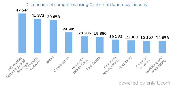 We have data on 990,905 companies that use Canonical Ubuntu. The companies using Canonical Ubuntu are most often found in United States and in the Information Technology and Services industry. Canonical Ubuntu is most often used by companies with 1-10 employees and 1M-10M dollars in revenue. Our data for Canonical Ubuntu usage goes back as far as 10 years and 1 months.