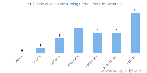 We have data on 26 companies that use Cerner ProFit. The companies using Cerner ProFit are most often found in United States and in the Hospital & Health Care industry. Cerner ProFit is most often used by companies with 1000-5000 employees and >1000M dollars in revenue. Our data for Cerner ProFit usage goes back as far as 8 years and 7 months.
