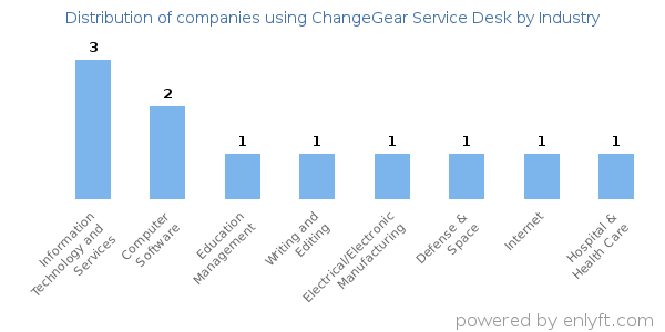 We have data on 11 companies that use ChangeGear Service Desk. The companies using ChangeGear Service Desk are most often found in United States and in the Information Technology and Services industry. ChangeGear Service Desk is most often used by companies with >10000 employees and >1000M dollars in revenue. Our data for ChangeGear Service Desk usage goes back as far as 8 years and 3 months.