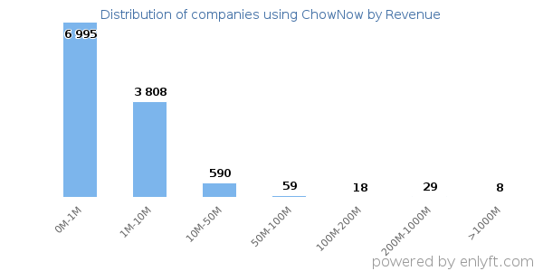 We have data on 12,700 companies that use ChowNow. The companies using ChowNow are most often found in United States and in the Restaurants industry. ChowNow is most often used by companies with 1-10 employees and 0M-1M dollars in revenue. Our data for ChowNow usage goes back as far as 5 years and 2 months.