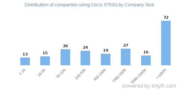 Of all the customers that are using Cisco 3750G, a majority (58%) are large (>$1000M), 22% are small (<$50M) and 13% are medium-sized.
