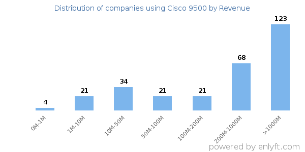 Of all the customers that are using Cisco 9500, a majority (64%) are large (>$1000M), 18% are small (<$50M) and 14% are medium-sized.