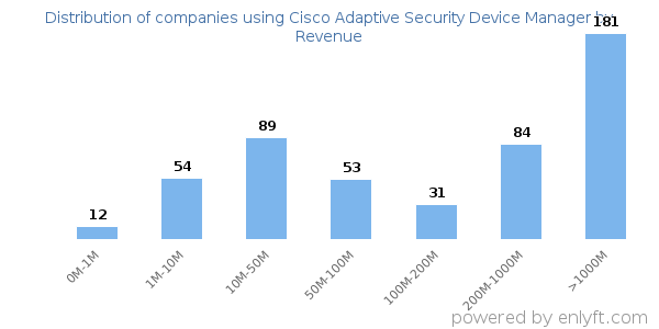 Of all the customers that are using Cisco Adaptive Security Device Manager, a majority (51%) are large (>$1000M), 28% are small (<$50M) and 16% are medium-sized.