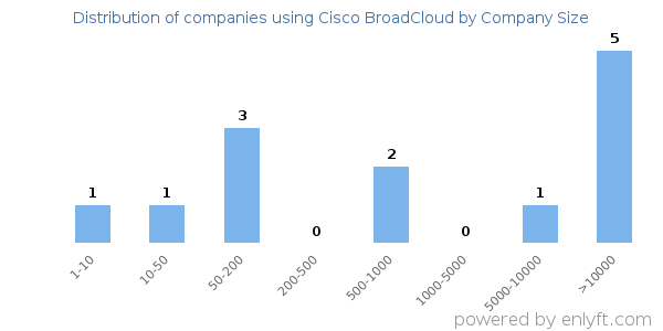 We have data on 13 companies that use Cisco BroadCloud. The companies using Cisco BroadCloud are most often found in United States and in the Telecommunications industry. Cisco BroadCloud is most often used by companies with >10000 employees and >1000M dollars in revenue. Our data for Cisco BroadCloud usage goes back as far as 2 years and 7 months.