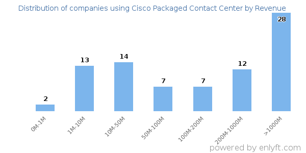 We have data on 85 companies that use Cisco Packaged Contact Center. The companies using Cisco Packaged Contact Center are most often found in United States and in the Information Technology and Services industry. Cisco Packaged Contact Center is most often used by companies with >10000 employees and >1000M dollars in revenue. Our data for Cisco Packaged Contact Center usage goes back as far as 8 years and 7 months.