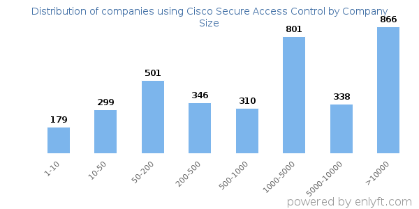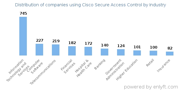 We have data on 3,683 companies that use Cisco Secure Access Control. The companies using Cisco Secure Access Control are most often found in United States and in the Information Technology and Services industry. Cisco Secure Access Control is most often used by companies with >10000 employees and >1000M dollars in revenue. Our data for Cisco Secure Access Control usage goes back as far as 9 years and 9 months.