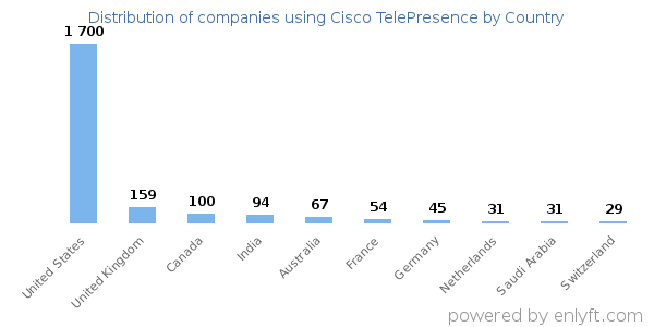 We have data on 2,753 companies that use Cisco TelePresence. The companies using Cisco TelePresence are most often found in United States and in the Information Technology and Services industry. Cisco TelePresence is most often used by companies with >10000 employees and >1000M dollars in revenue. Our data for Cisco TelePresence usage goes back as far as 10 years and 2 months.